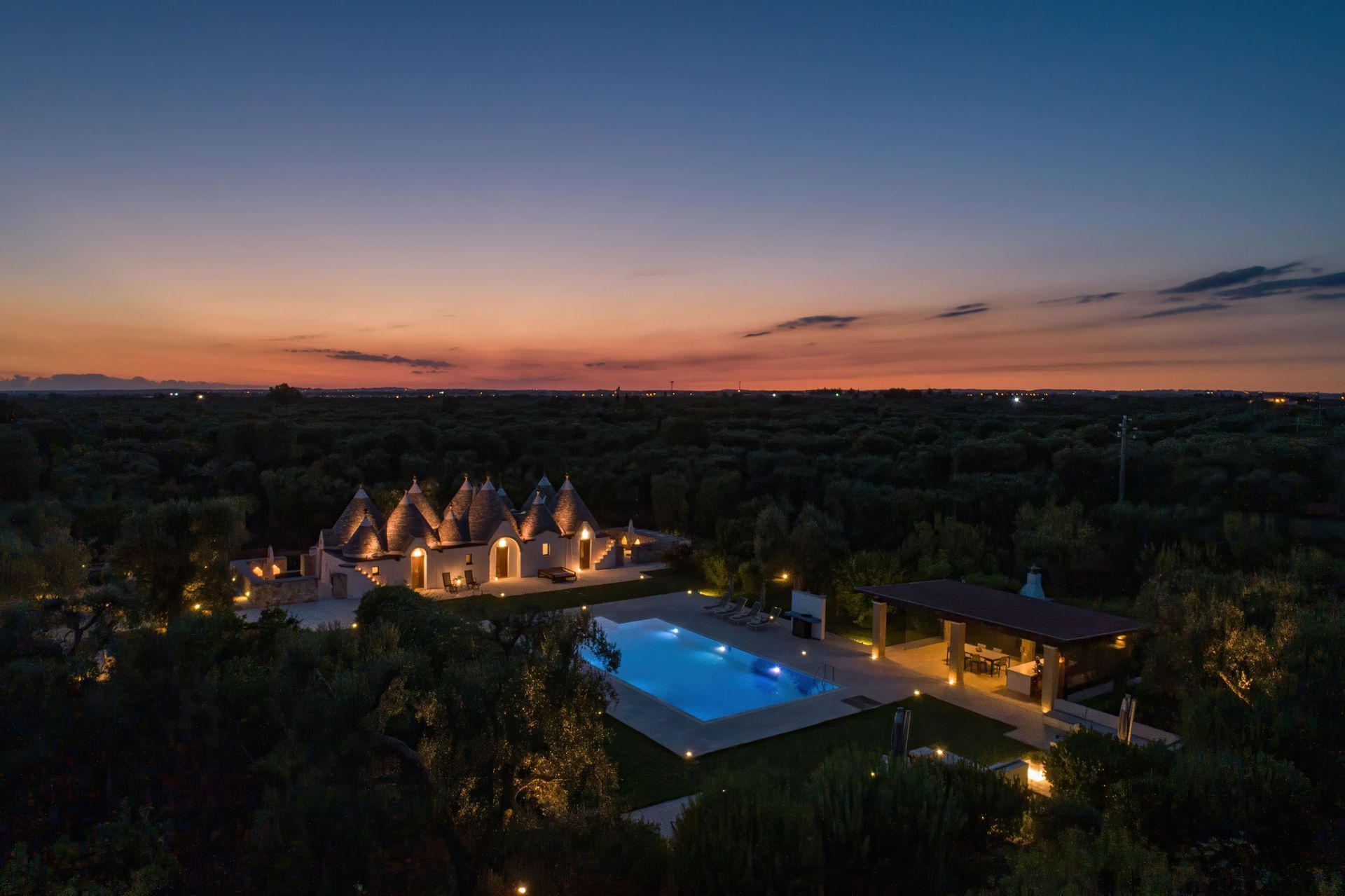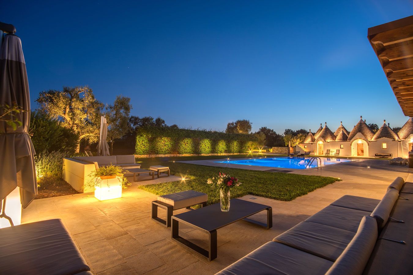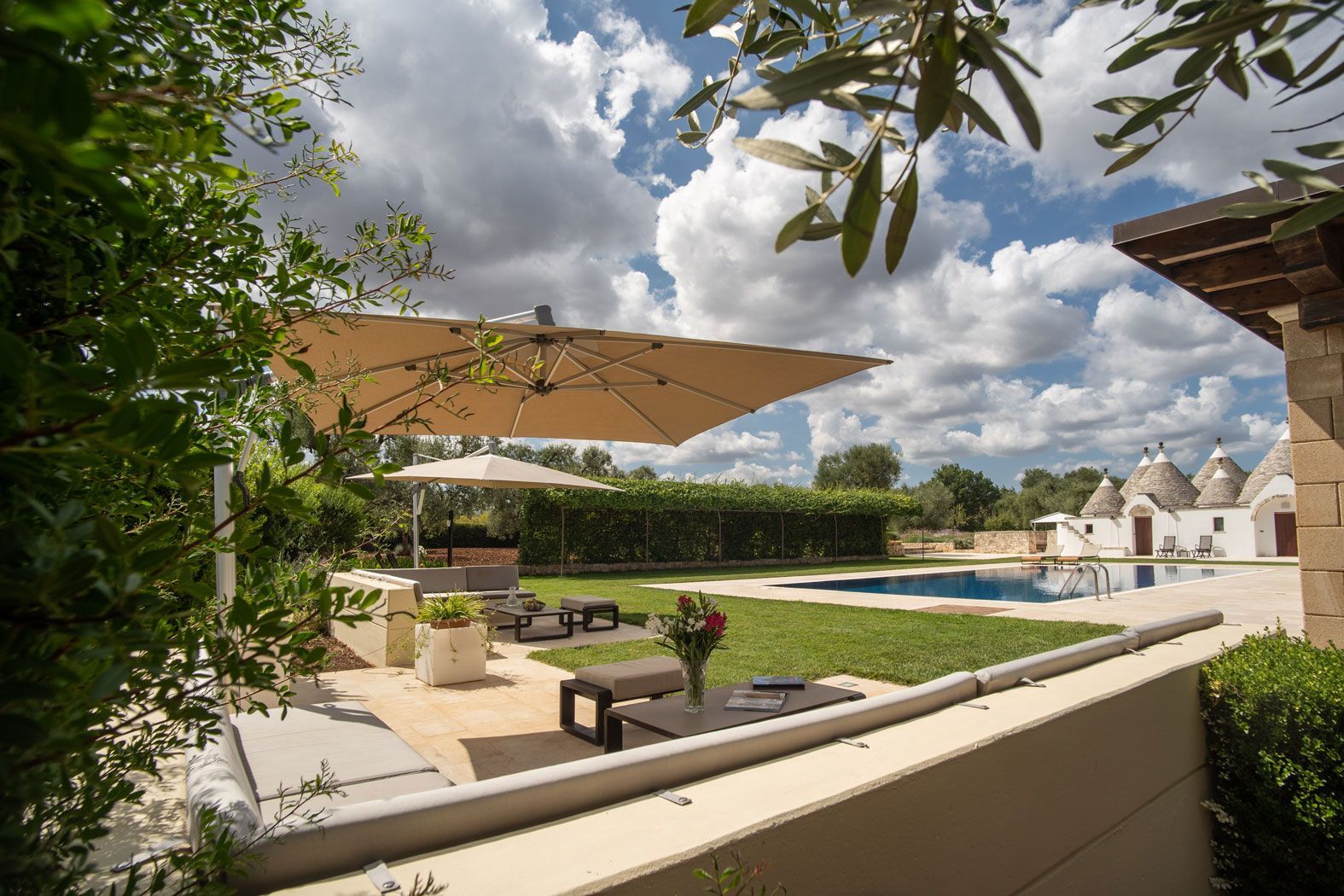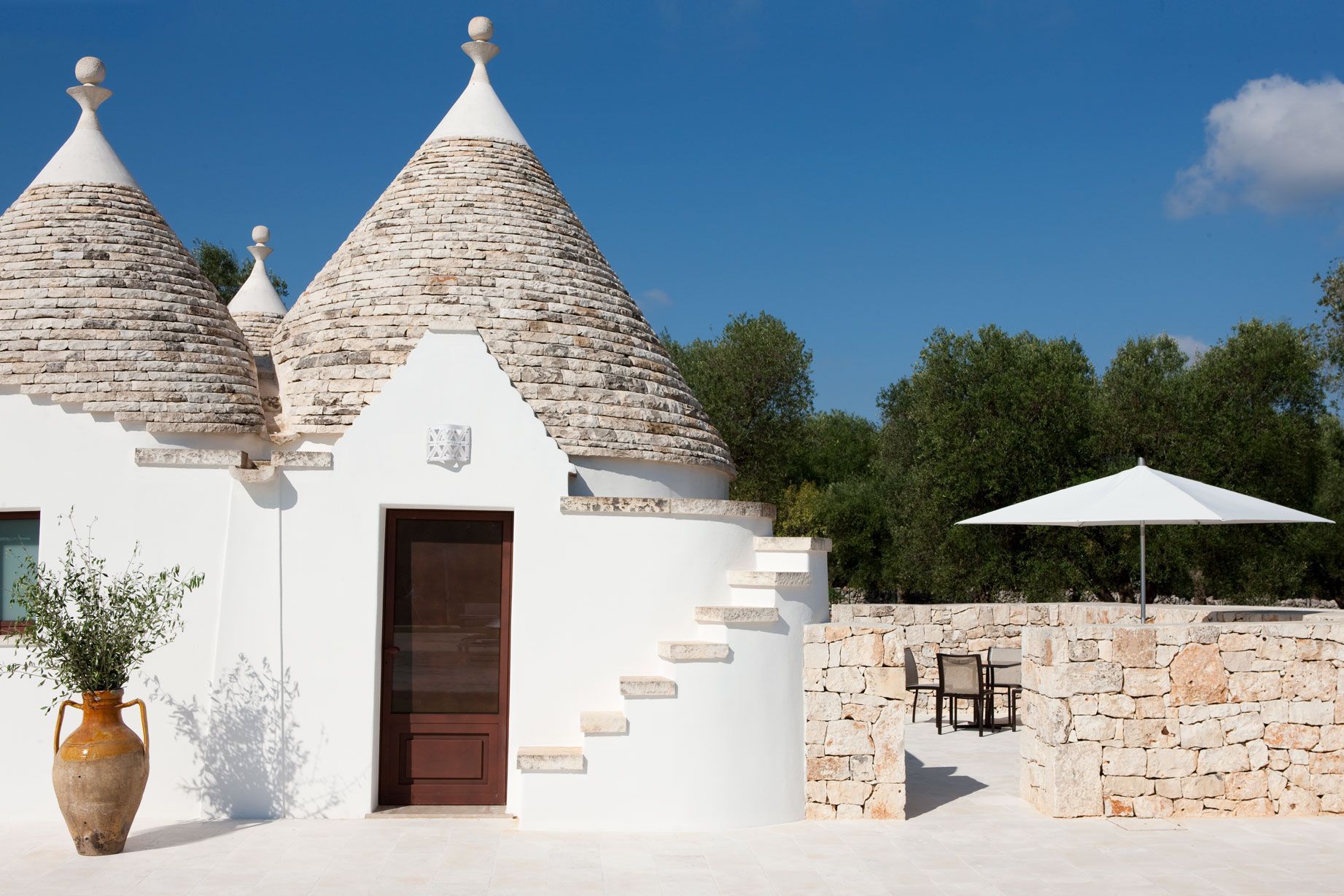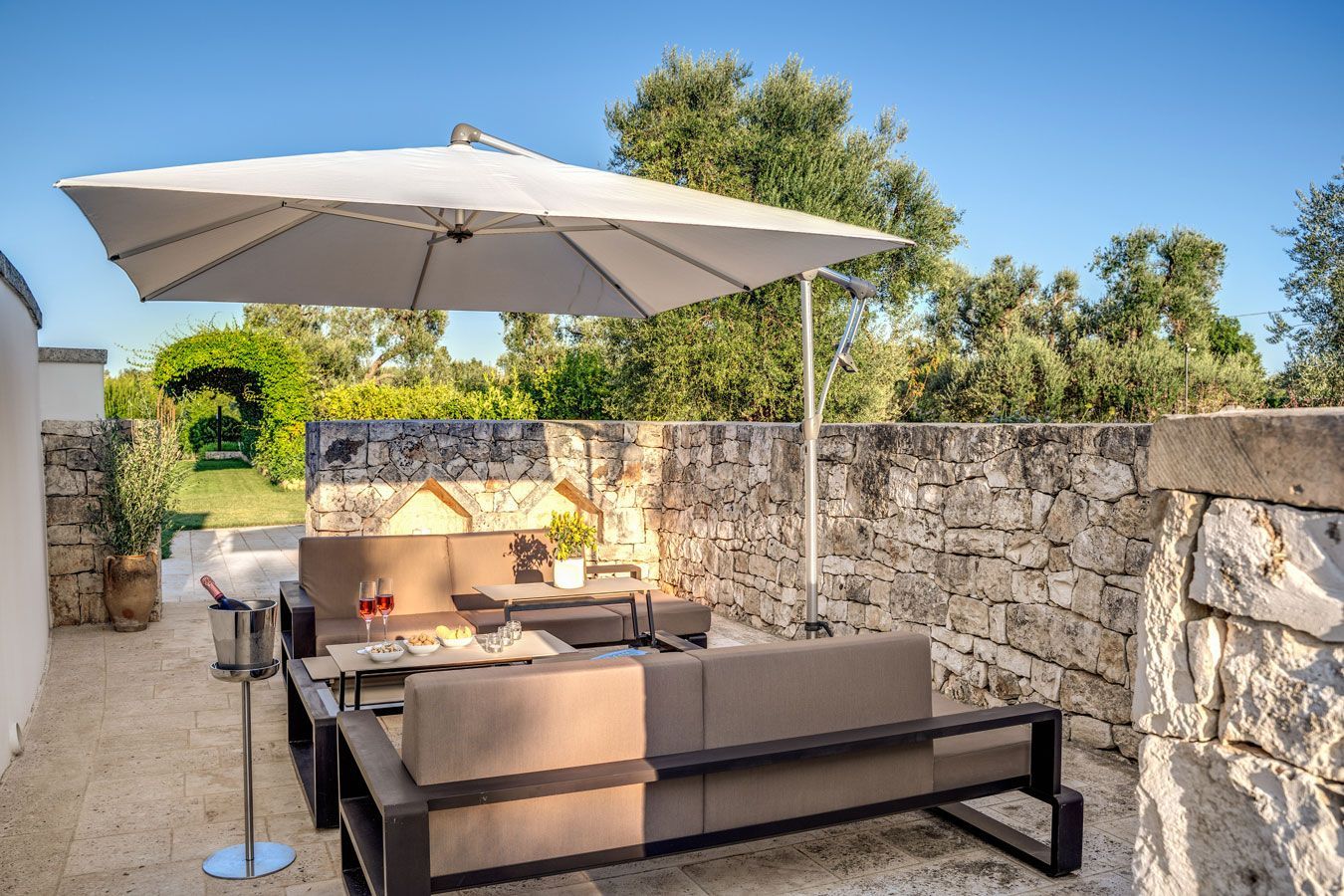 Le due corti che si trovano sul lato destro e sinistro del trullo sono arredate con divani, tavoli e ombrelloni. La proprietà, completamente recintata, dispone di un parcheggio privato e di un sistema di allarme.