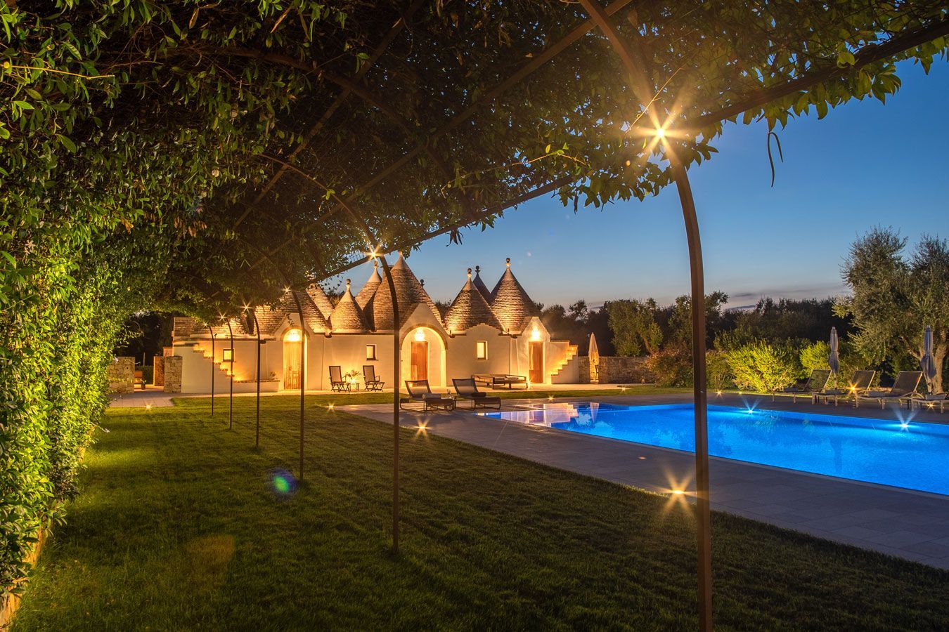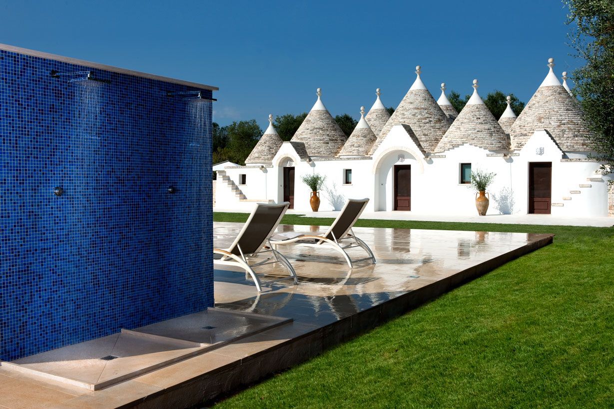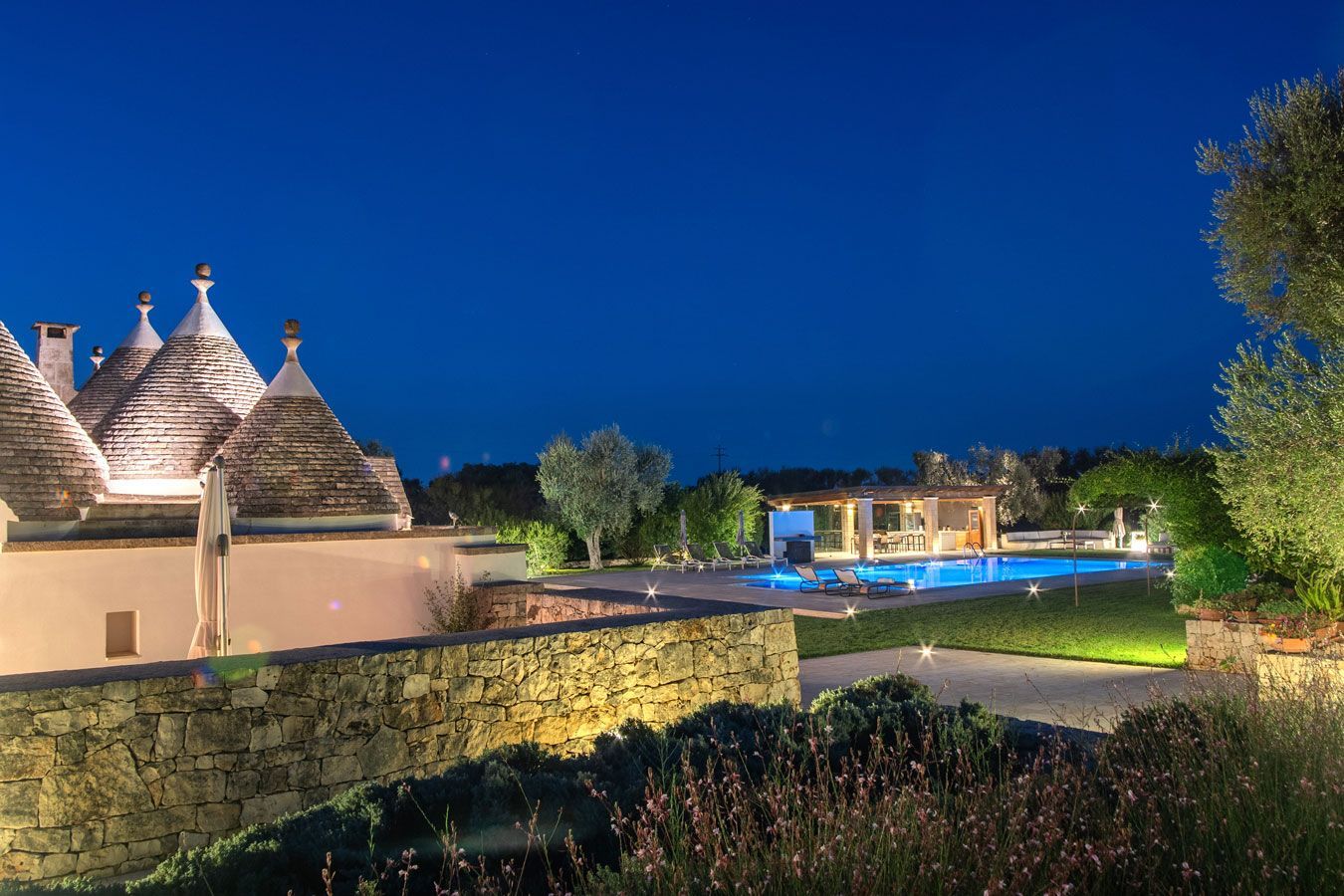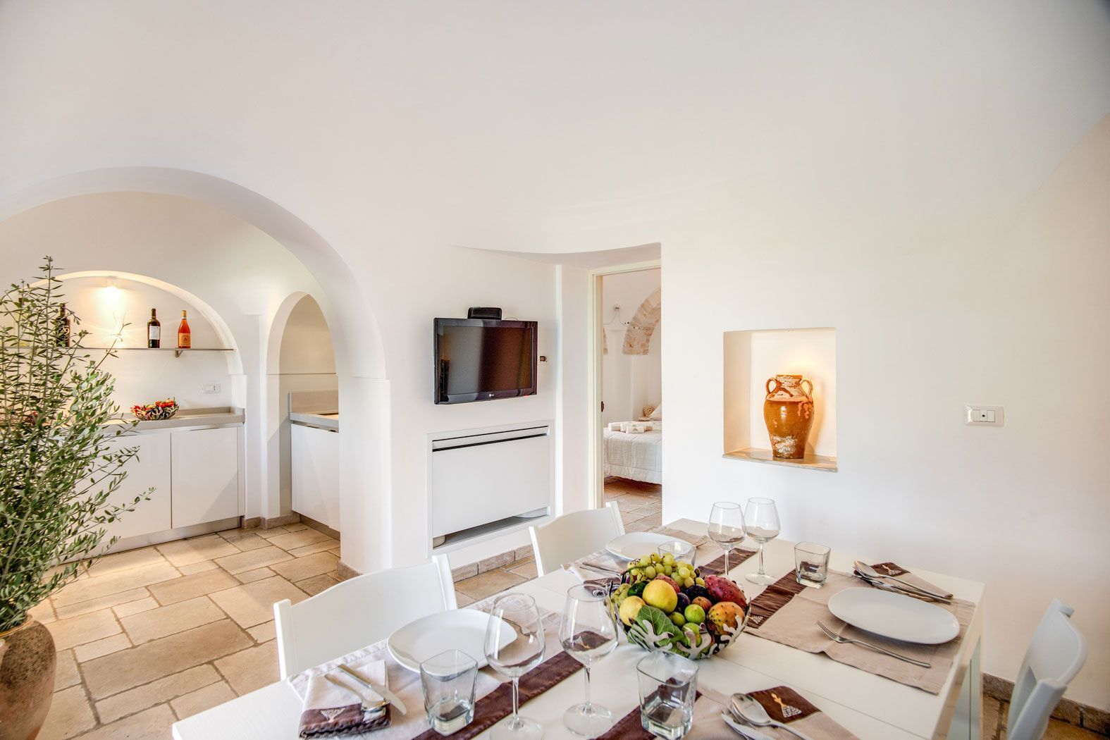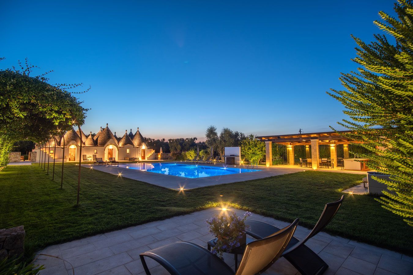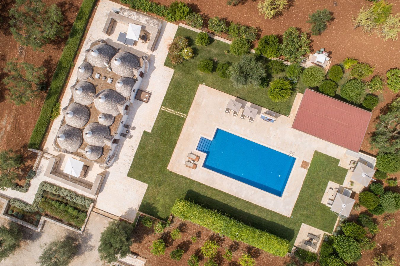 Le due corti che si trovano sul lato destro e sinistro del trullo sono arredate con divani, tavoli e ombrelloni. La proprietà, completamente recintata, dispone di un parcheggio privato e di un sistema di allarme.