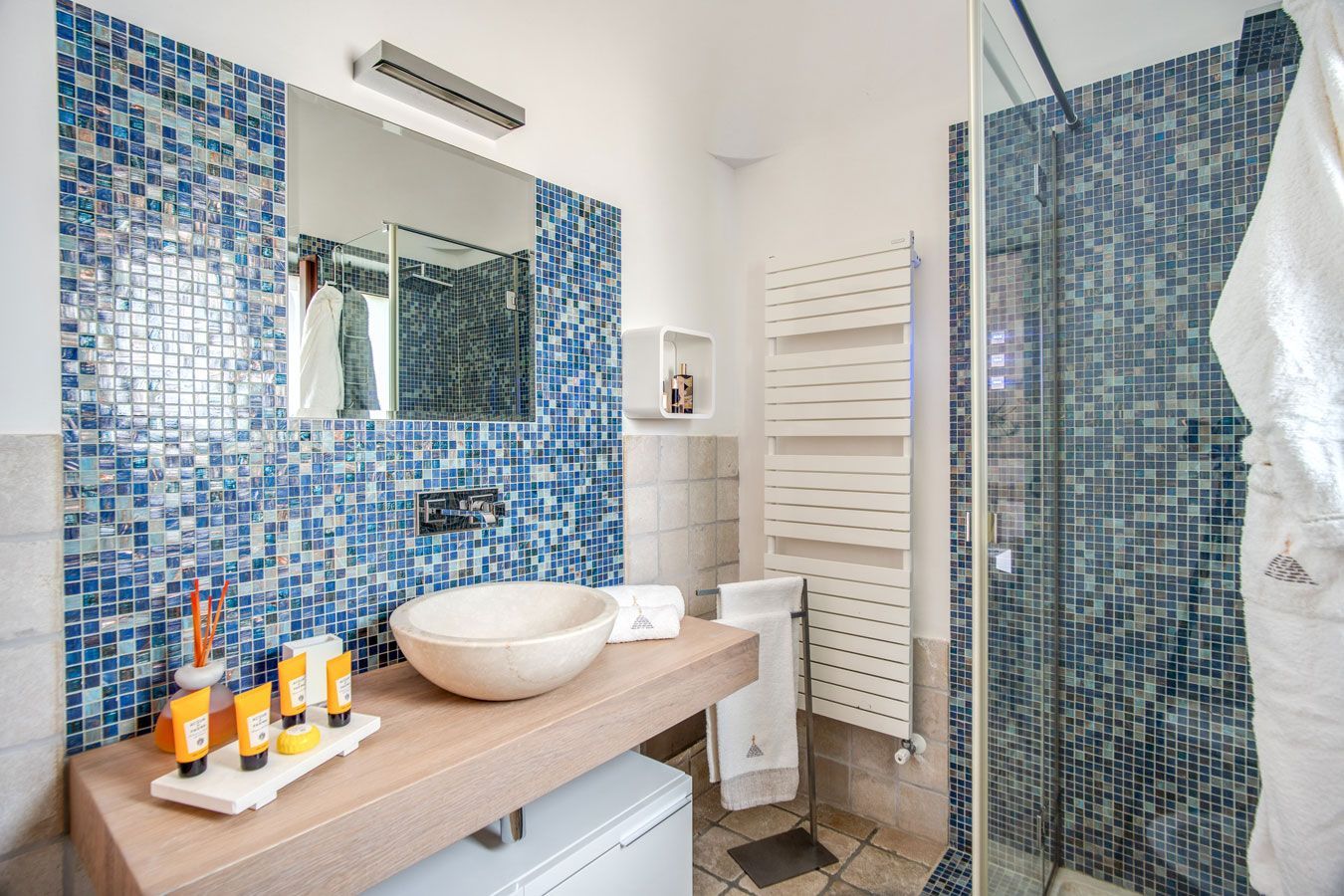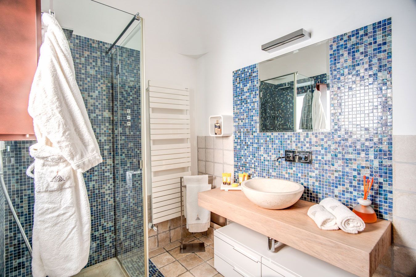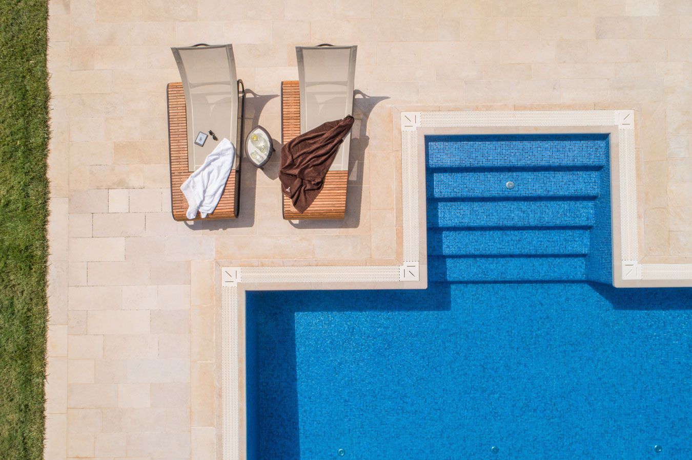 La piscina a cascata, di 14x7 metri, è interamente decorata con mosaici blu cobalto. Dispone di due docce, e accappatoi e asciugamani sono forniti di serie.