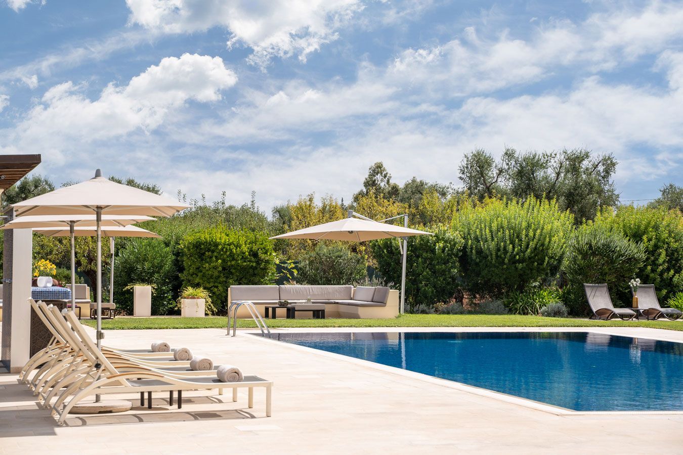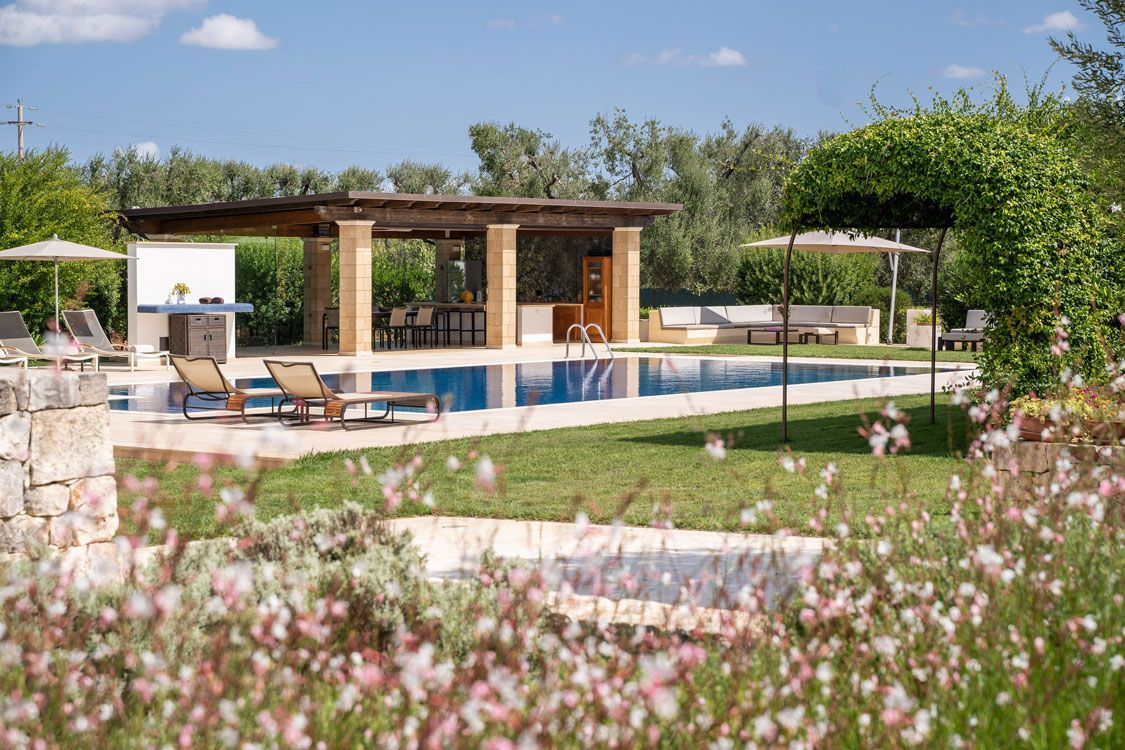 Nell'area della piscina si trova una zona relax con divani in muratura, cuscini, tavoli e ombrelloni, ideale per rilassarsi al sole e gustare un cocktail. La piscina è fiancheggiata da profumati gelsomini, creando l’atmosfera perfetta per un piacevole riposo all’ombra.
