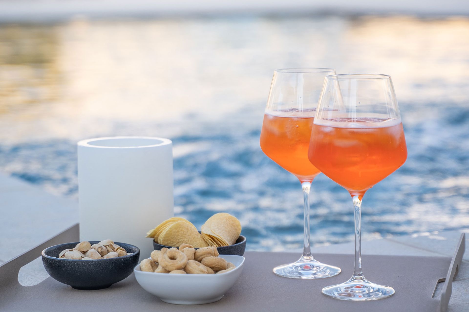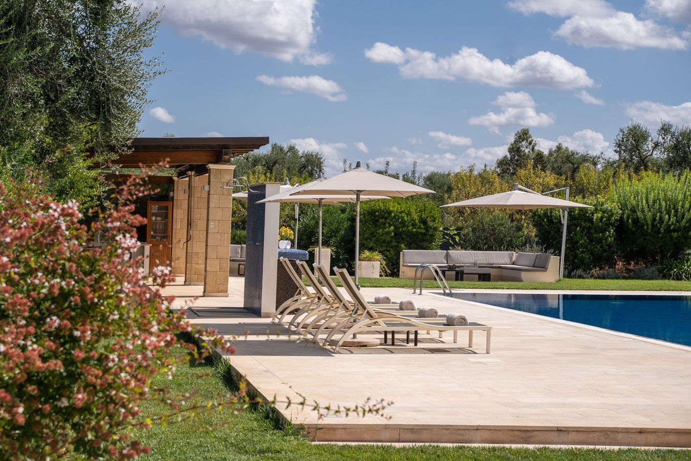 Nell'area della piscina è presente una zona relax con divani in muratura, cuscini, tavoli e ombrelloni, dove potersi rilassare al sole e gustare un cocktail. L’area esterna è dotata di un impianto stereo hi-fi ed è il luogo ideale per feste esclusive.